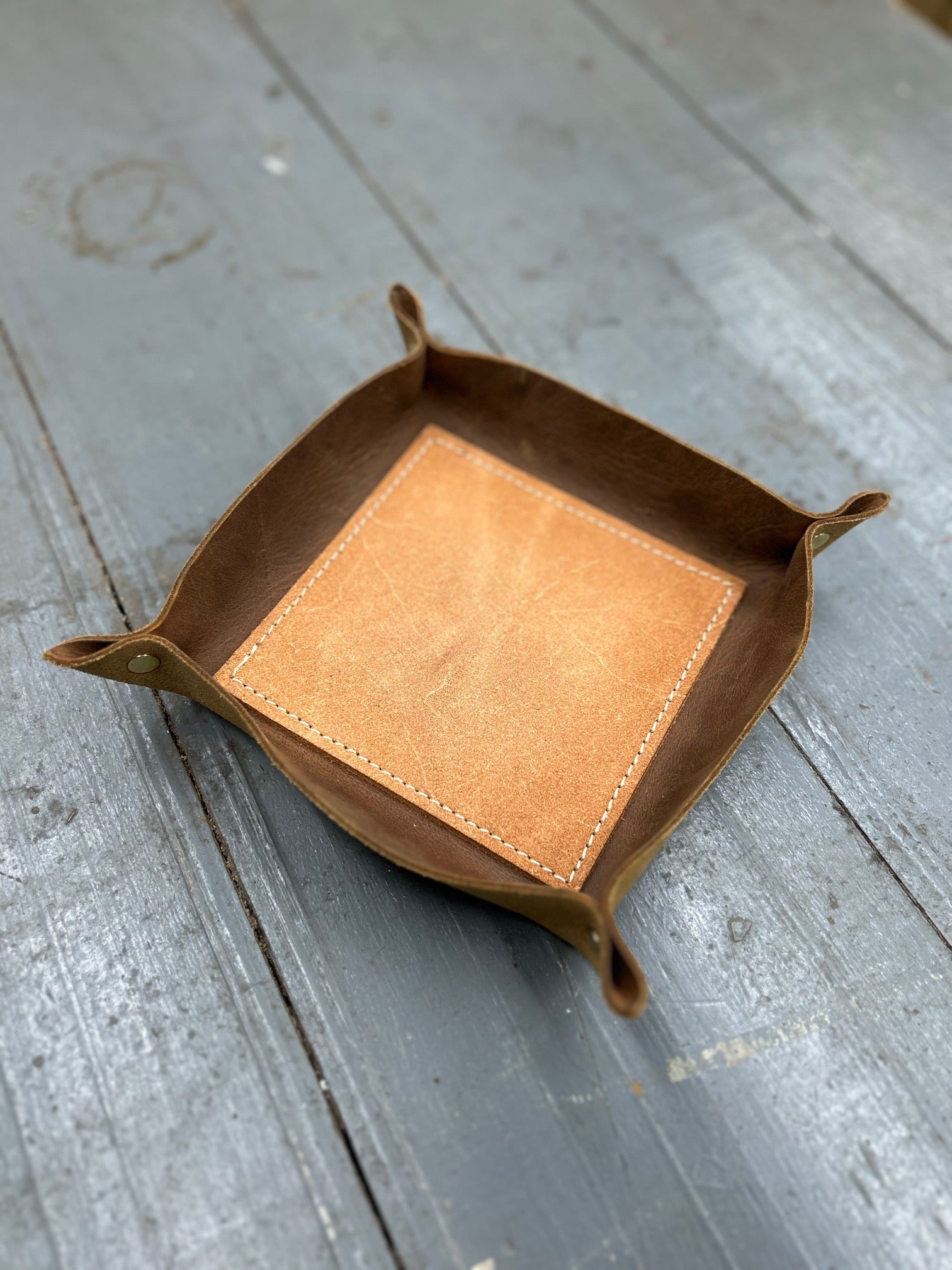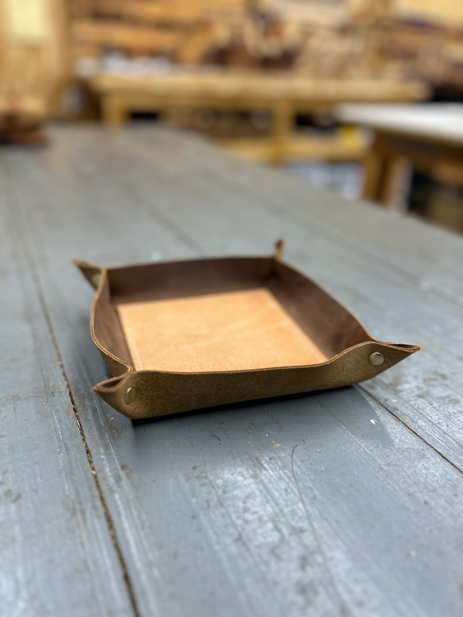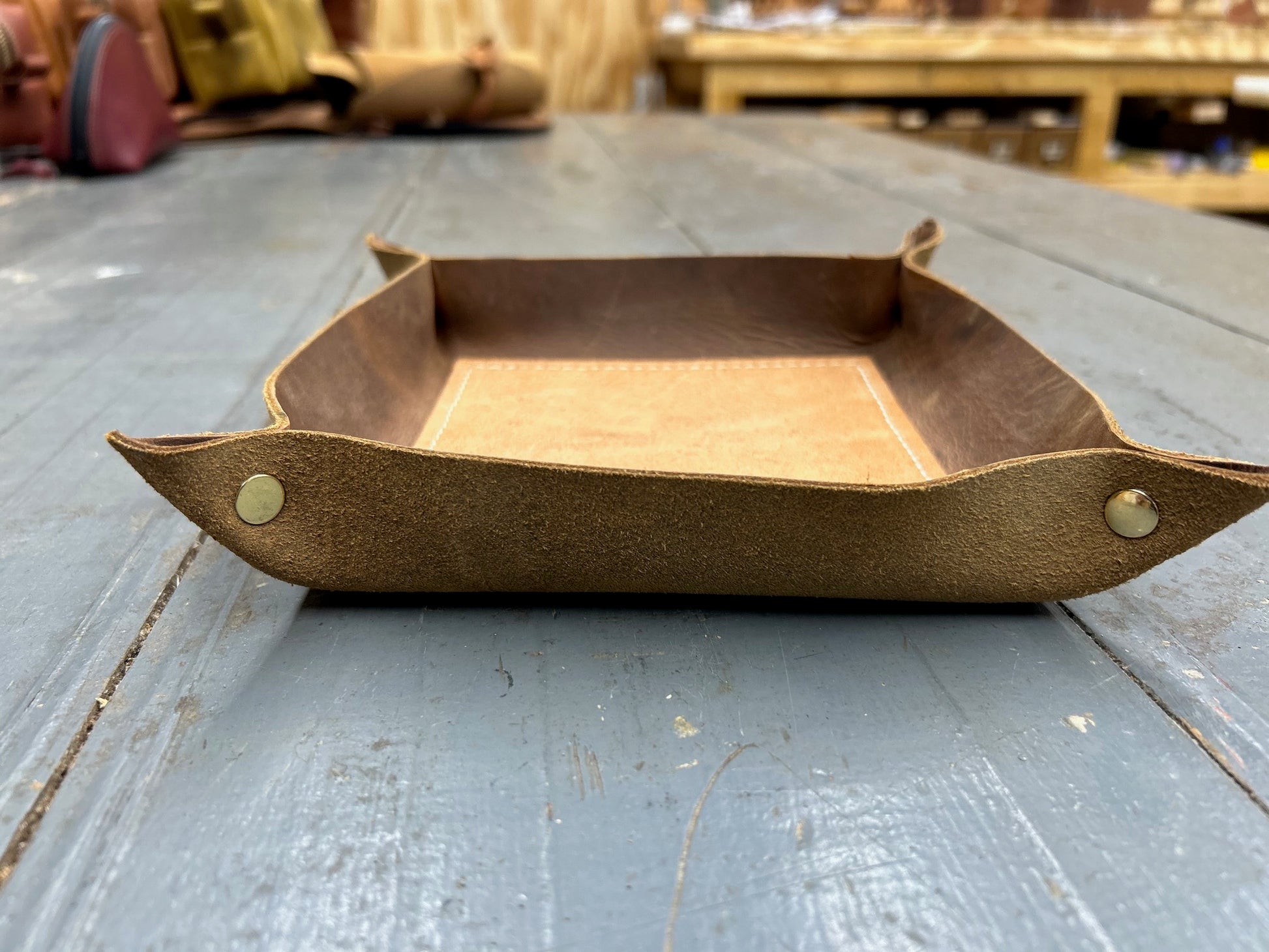 A place for what matters.  This full-grain leather valet tray keeps your daily essentials-keys, watch, wallet-right where you need them.  Hand-cut, riveted, stitched and formed with care, it brings quiet order to your nightstand, desk, or entry way.