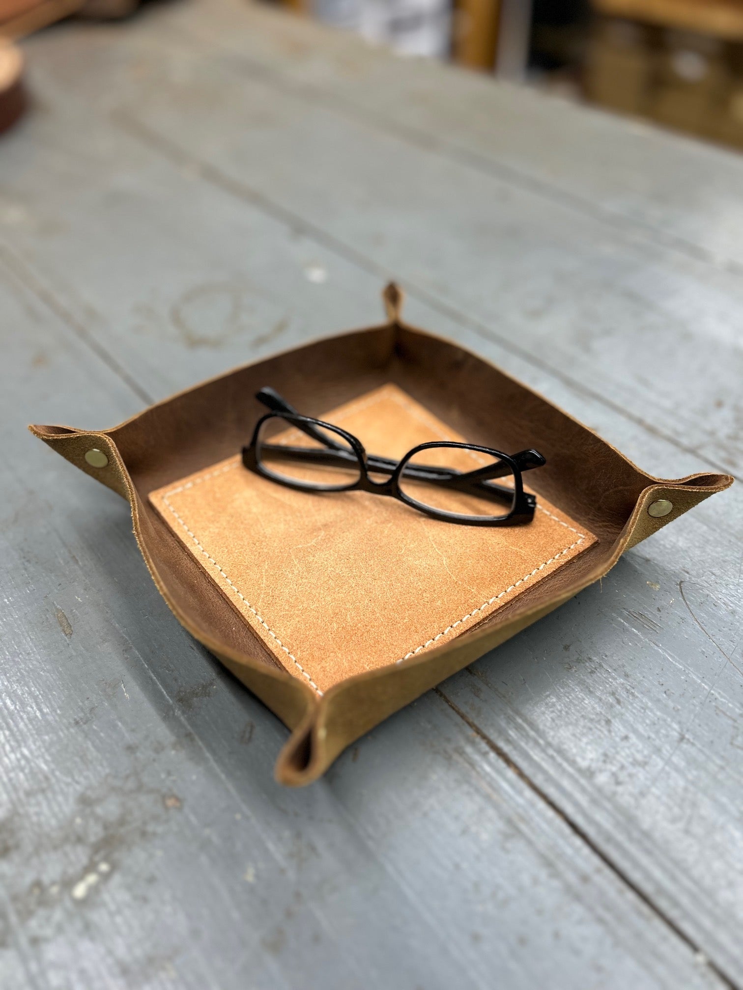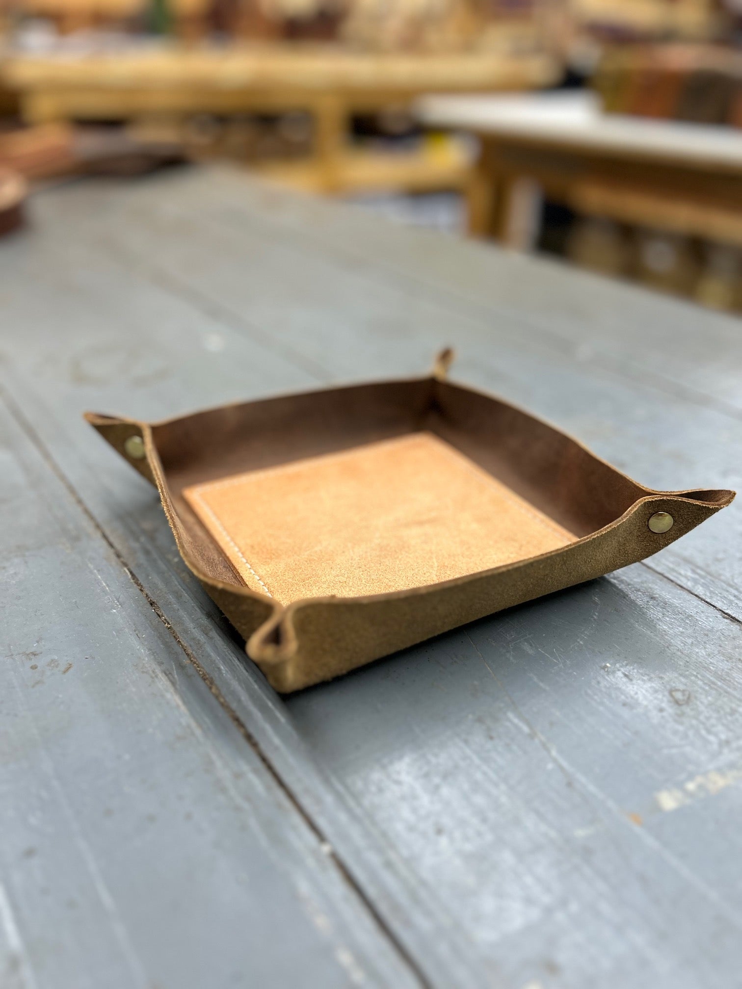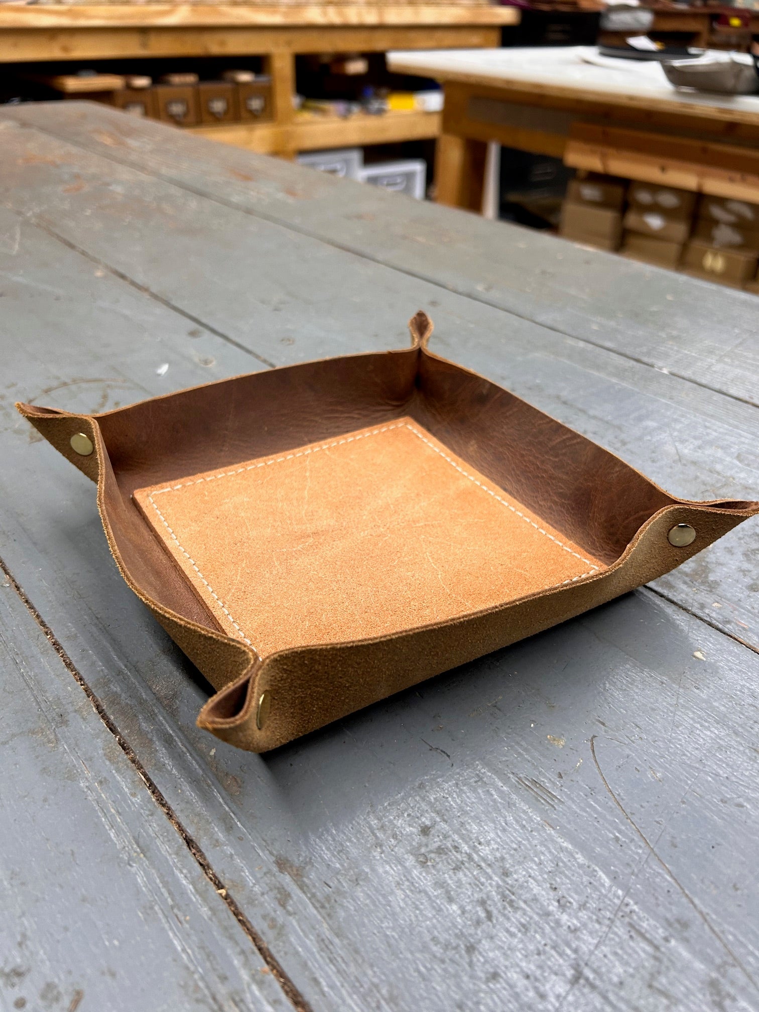 A place for what matters.  This full-grain leather valet tray keeps your daily essentials-keys, watch, wallet-right where you need them.  Hand-cut, riveted, stitched and formed with care, it brings quiet order to your nightstand, desk, or entry way.
