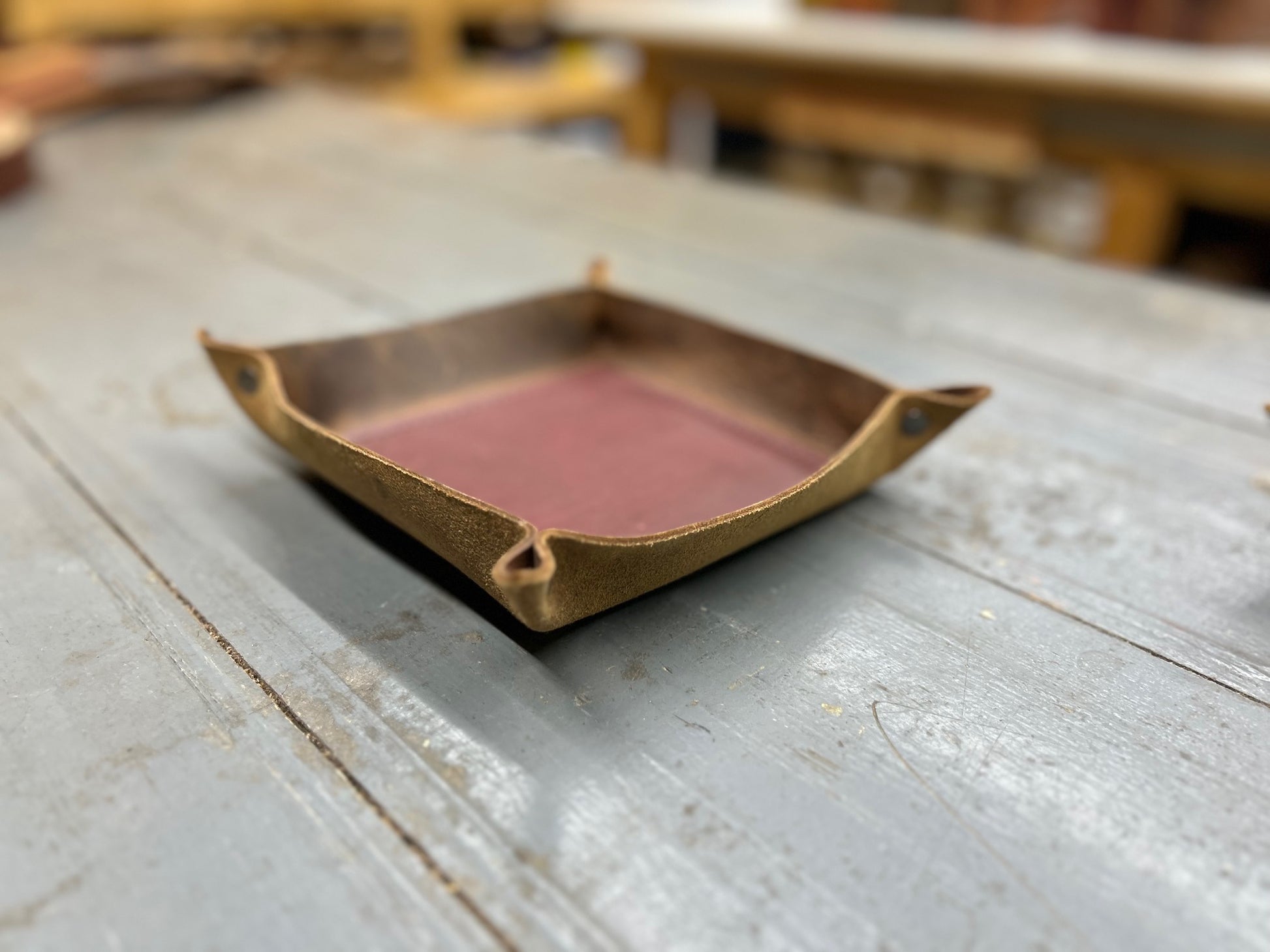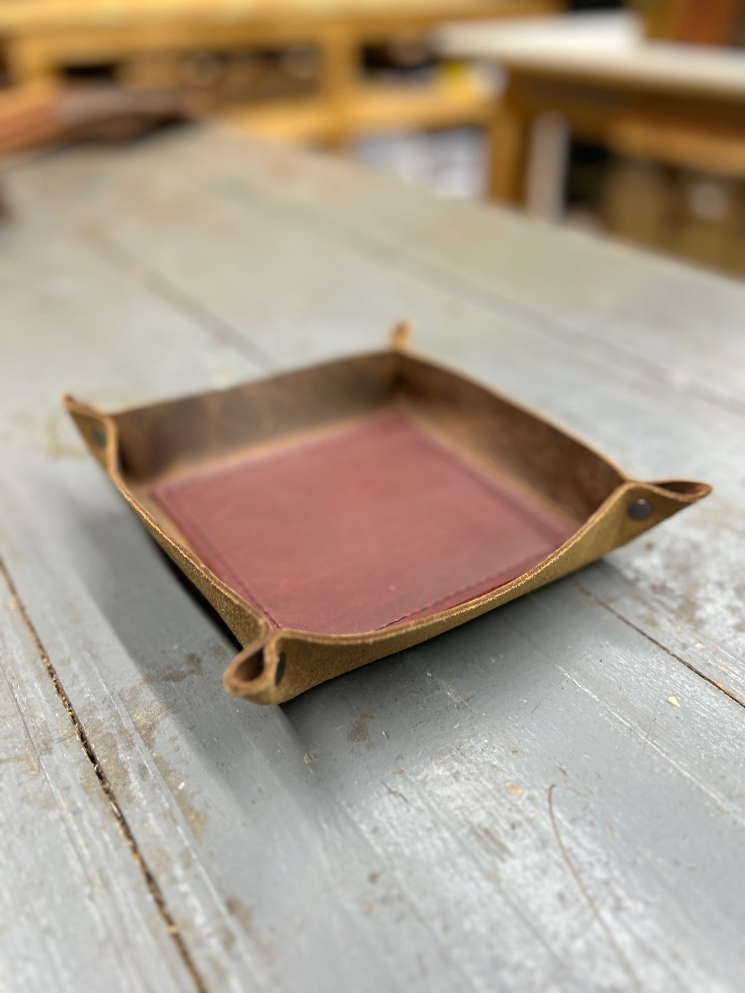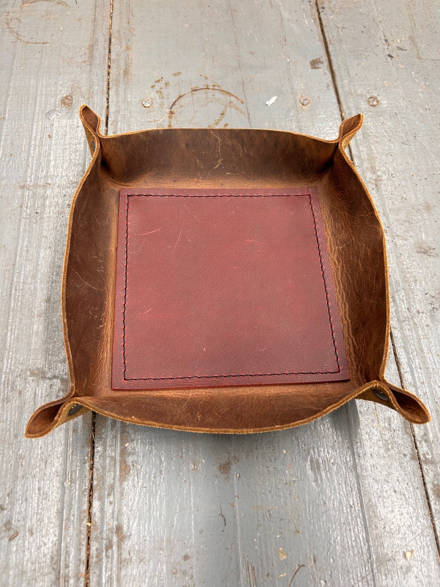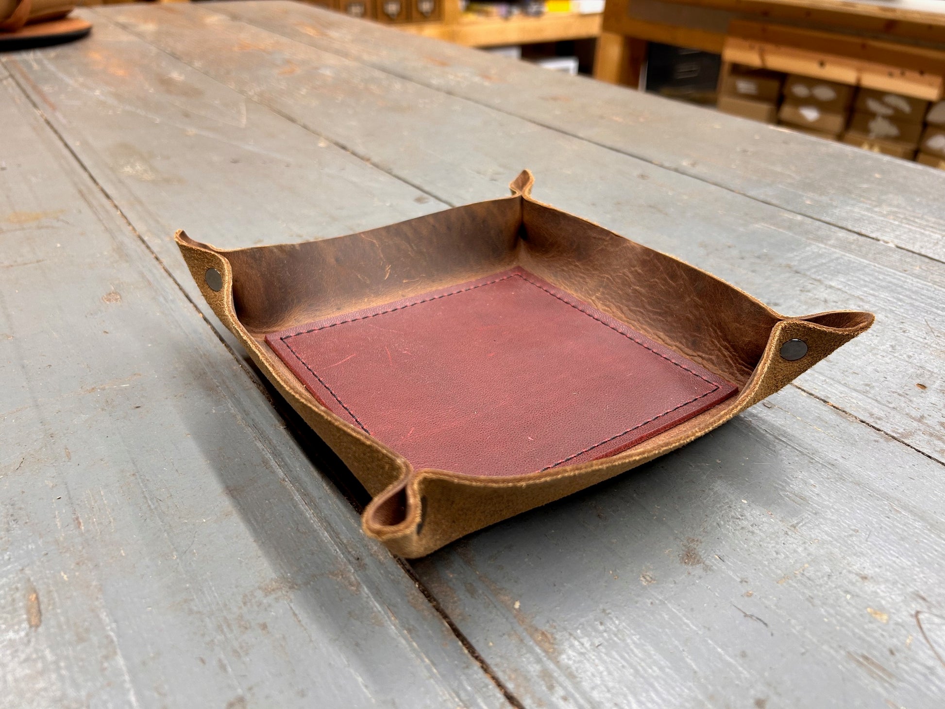 A place for what matters.  This full-grain leather valet tray keeps your daily essentials-keys, watch, wallet-right where you need them.  Hand-cut, riveted, stitched and formed with care, it brings quiet order to your nightstand, desk, or entry way.