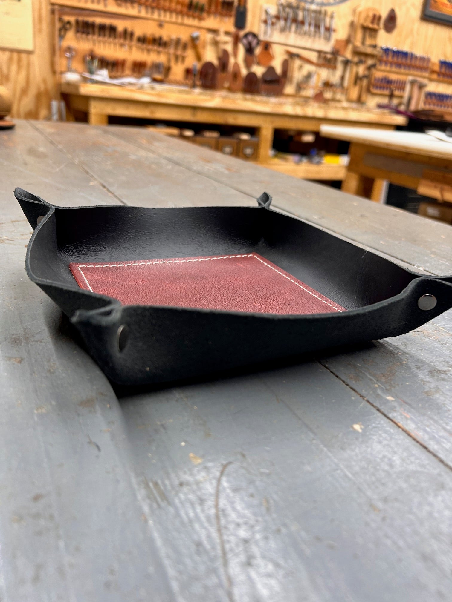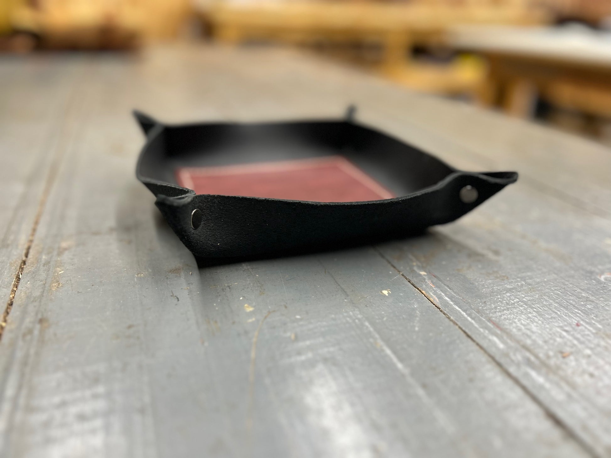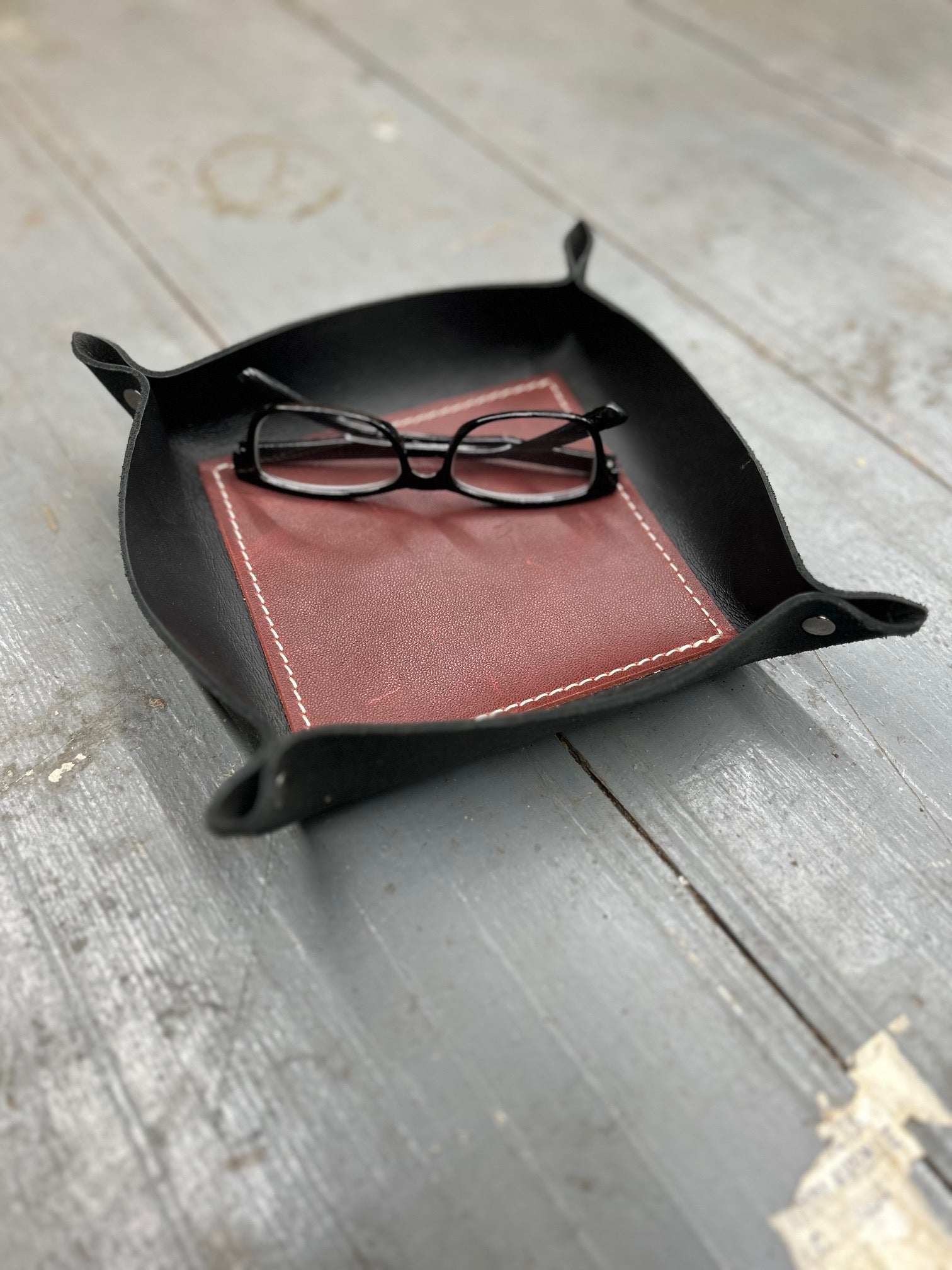 A place for what matters. This full-grain leather valet tray keeps your daily essentials-keys, watch, wallet-right where you need them. Hand-cut, riveted, stitched and formed with care, it brings quiet order to your nightstand, desk, or entry way.