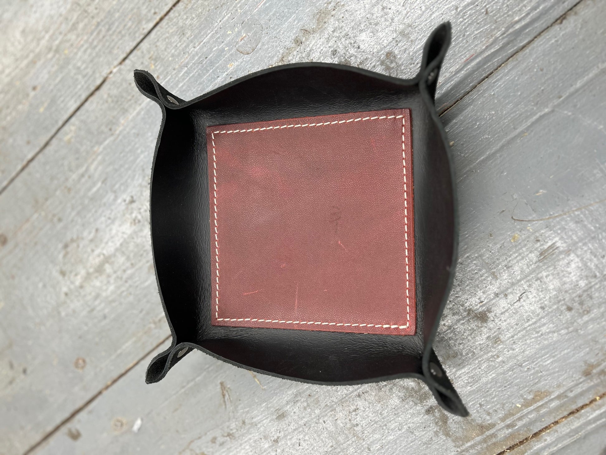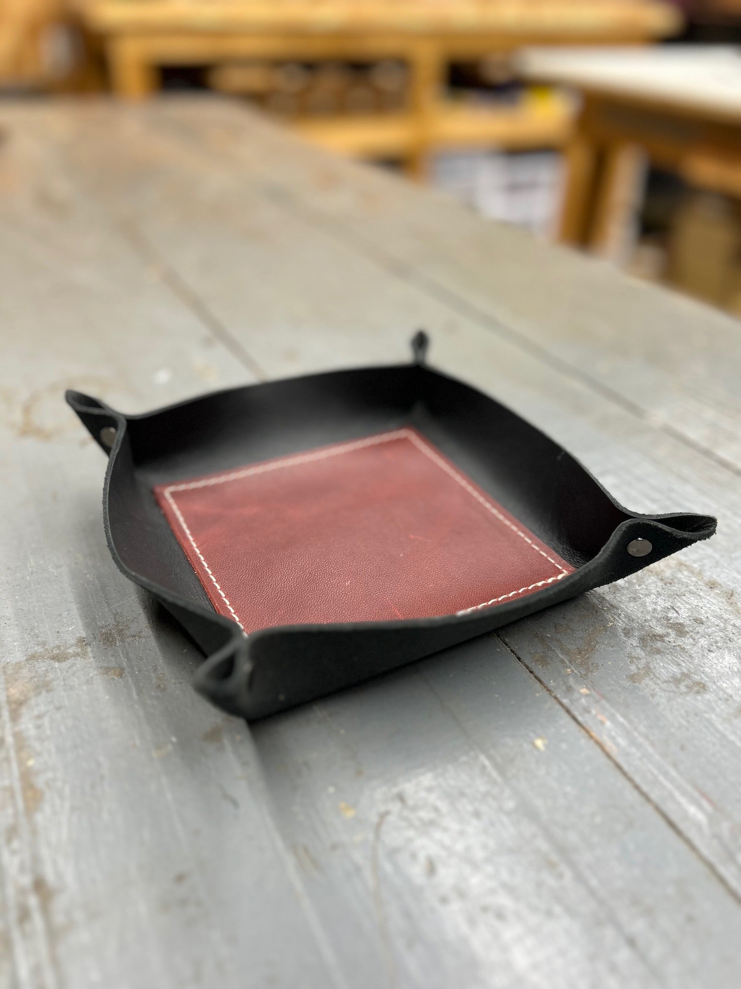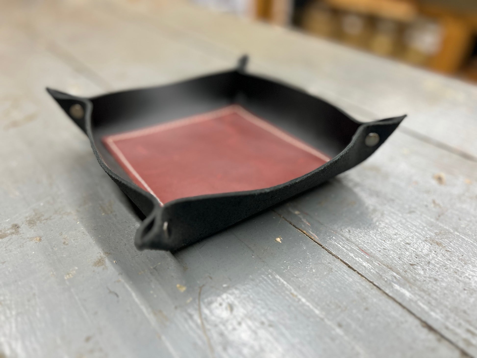 A place for what matters. This full-grain leather valet tray keeps your daily essentials-keys, watch, wallet-right where you need them. Hand-cut, riveted, stitched and formed with care, it brings quiet order to your nightstand, desk, or entry way.