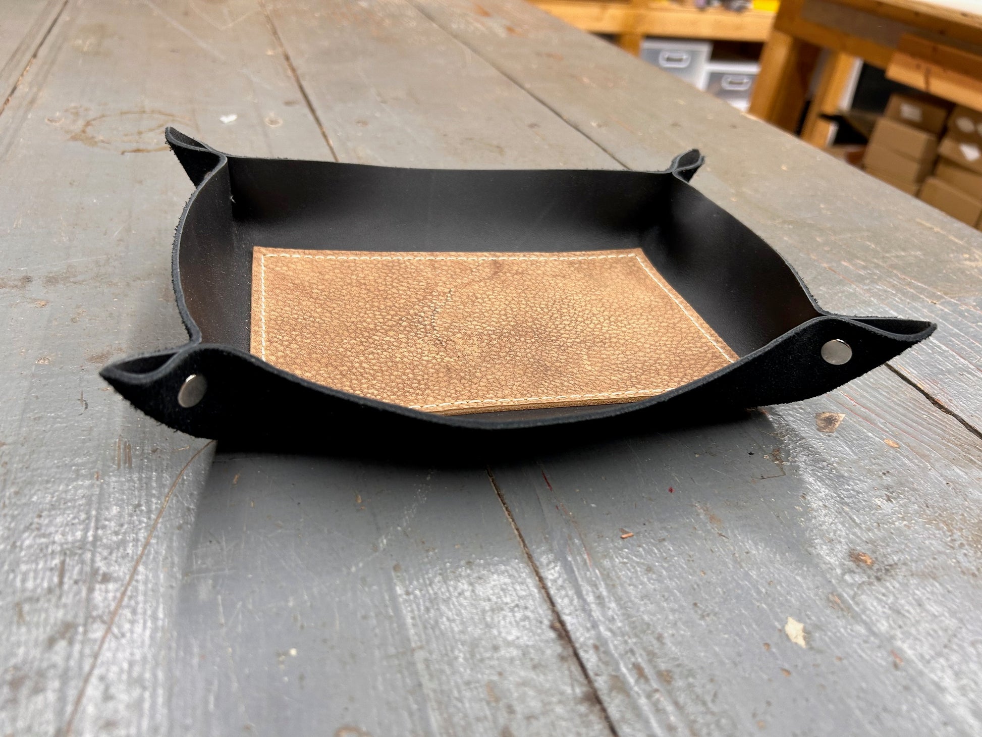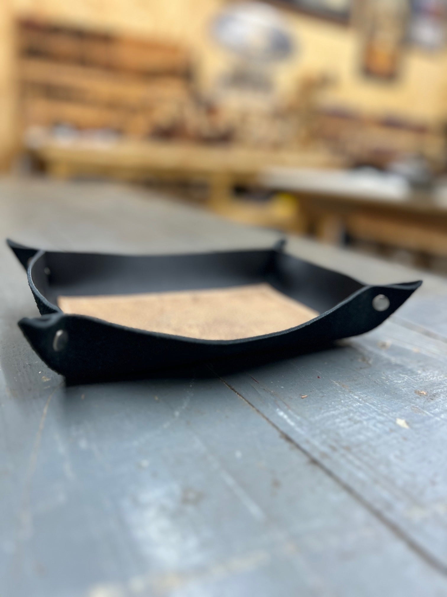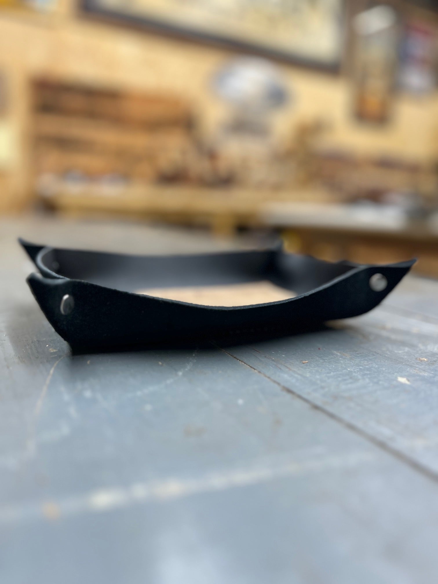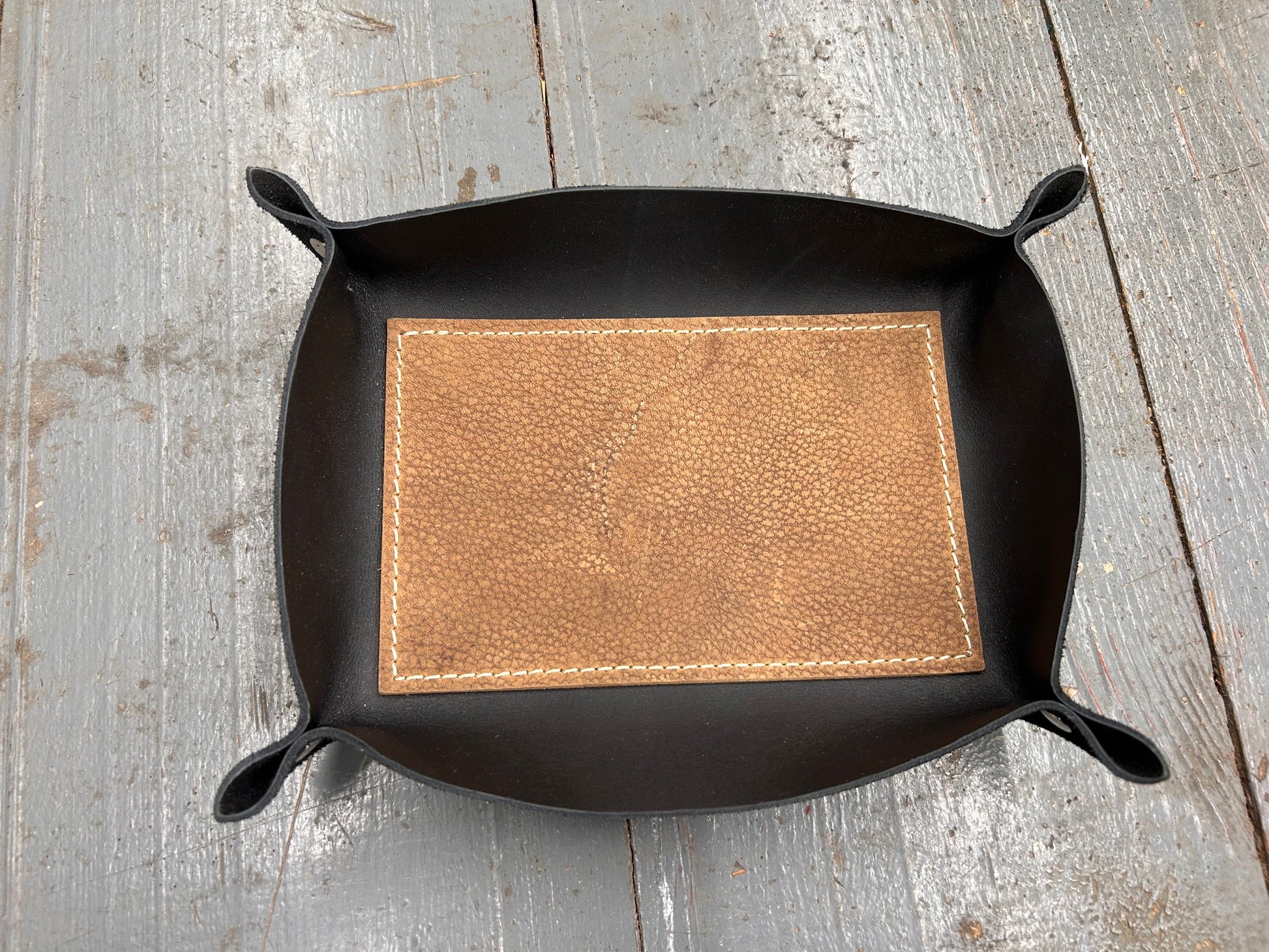 A place for what matters.  This full-grain leather valet tray keeps your daily essentials-keys, watch, wallet-right where you need them.  Hand-cut, riveted, stitched and formed with care, it brings quiet order to your nightstand, desk, or entry way.